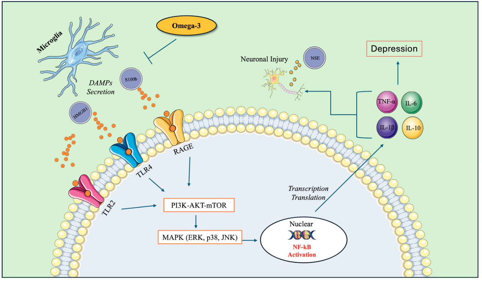 ω-3 PUFA可以透過調節這些路徑來中斷這種發炎反應,降低TLR和RAGE受體的活性,從而減少NF-κB信號的激活。這種下調作用有助於減少發炎因子水平,從而保護神經細胞,可能有助於改善憂鬱相關的健康狀況。此外,ω-3 PUFA也降低了神經損傷標記物如NSE的釋放,顯示神經細胞的損害減少,免疫反應較為平衡。